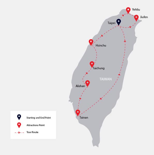 After breakfast, transfer to Taipei Taoyuan International Airport (TPE) or Taipei Songshan Airport (TSA) for departure.